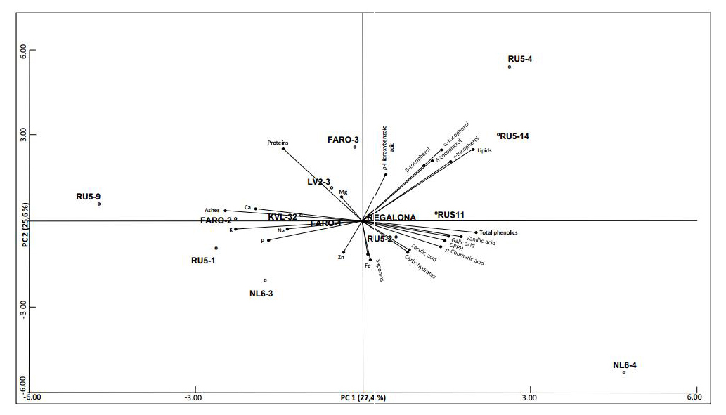 Regarding the distribution of the selected lines in the biplot graph, the first component (PC 1) allowed us to differentiate those with the highest ash, mineral, and protein contents (RU5-9, RU5-1, FARO-2, and NL6-3) from those that presented higher content of lipids and phenolic compounds with in vitro antioxidant activity. The second component (PC 2) clearly showed a distinction between those lines rich in lipids and tocopherols (RU5-14 and RU5-4) from those with a higher content of phenolic compounds and higher in vitro antioxidant activity (NL6-4 and RU5-2).