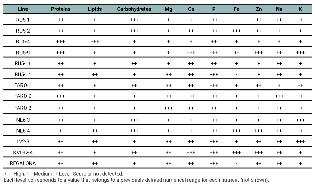 Nutrient levels qualitative comparison of the grains from the selected quinoa lines.