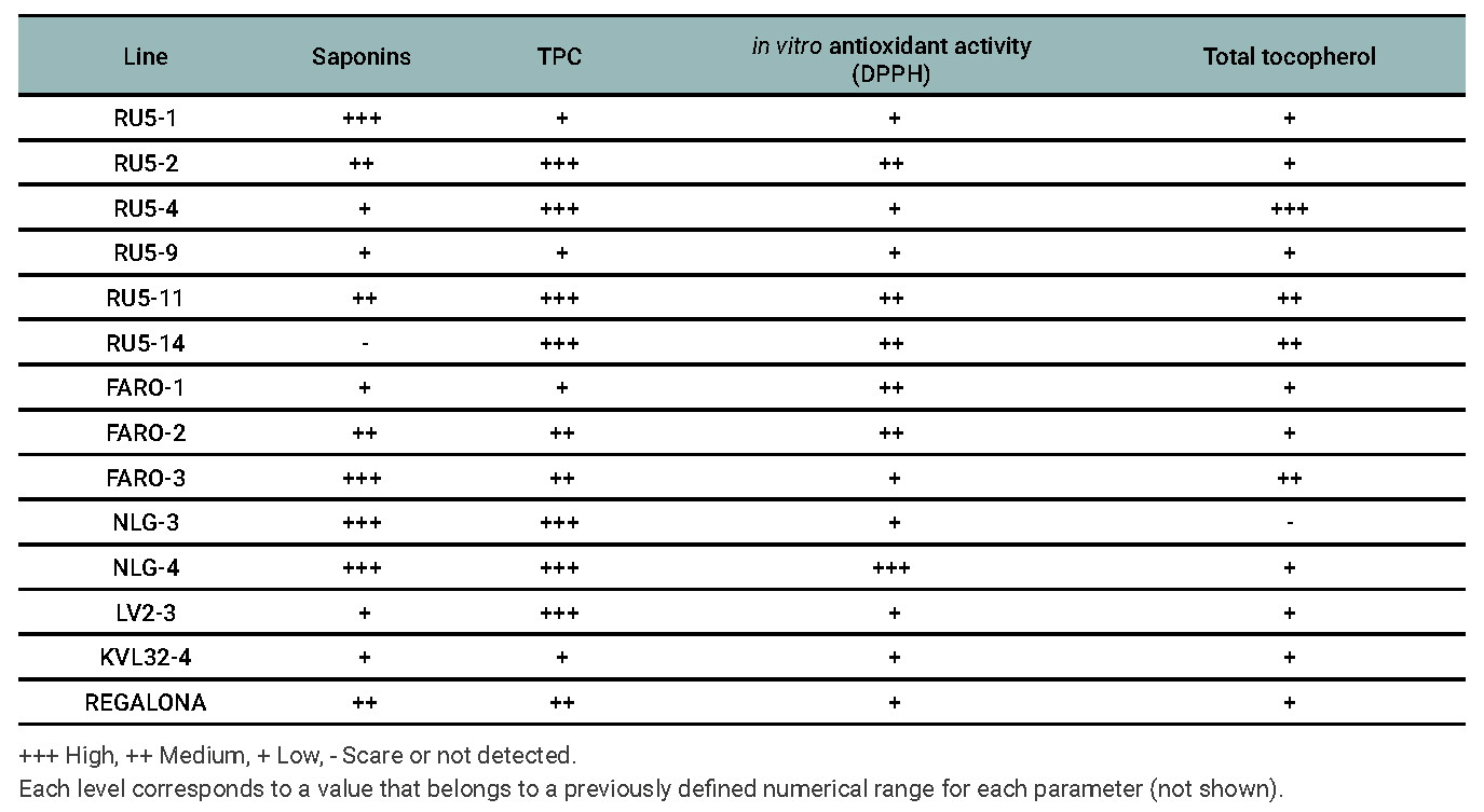 The multivariate statistical analysis did not allow identifying a quinoa line among the 14 selected that can be considered ideal, considering the analyzed chemical parameters of the grains. However, it led to the identification of those with specific characteristics to be cultivated in the region. In this way, considering the composition of macronutrients, there is no preferred line. However, taking into account the lower content of saponins, the higher contents of lipids (including tocopherols), RU5-14 and, especially RU5-4, could be considered the most promising for cultivation in the region. Otherwise, if the objective is to select quinoa lines with high levels of phenolic compounds in their grains, RU5-2 and NL6-4 should be selected for harvesting.