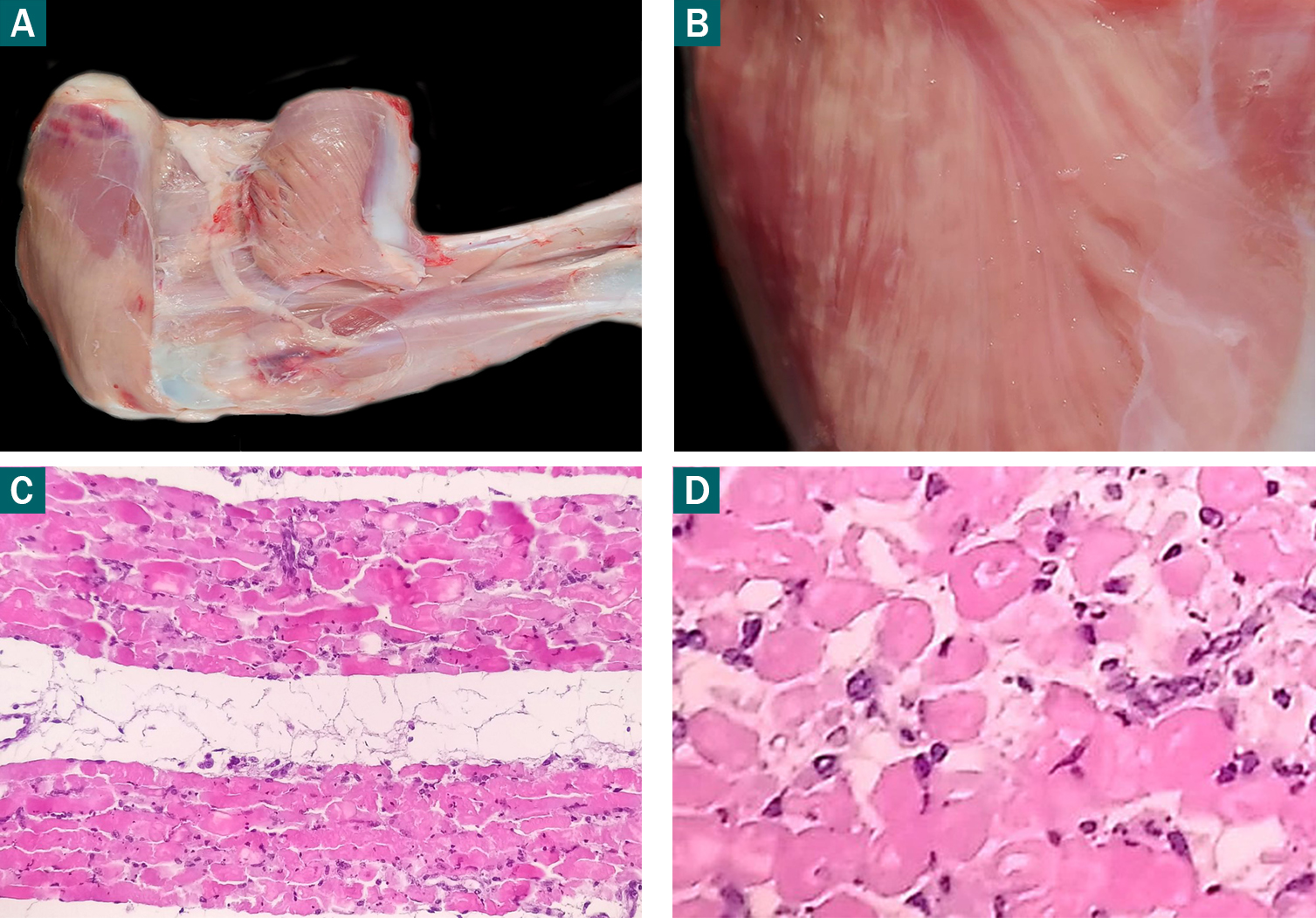 A. Macroscopic finding in muscular dystrophy due to Se deficiency in the limbs. Note the pale areas interspersed with normal areas. B. Muscular dystrophy in hind limbs muscle. C, D. Longitudinal and transverse cut sections of striated skeletal muscle, respectively. Hypereosinophilia, fragmentation, and vacuolization of the myofibrils (10X, H&E).