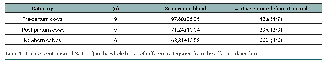 The concentrations of Se in the whole blood of prepartum and postpartum cows and newborn calves are shown in table 1. Briefly, low levels of selenium were observed in a high percentage of pre-partum (97,7±36,4 ppb) and post-partum (71,2±10,0 ppb) cows, and in newborn calves (68,3±10,5 ppb). In cattle, selenium values greater than 210 ppb are considered normal. In this case, the levels were much lower than those established in the bibliography (Kinkaid, 2000).