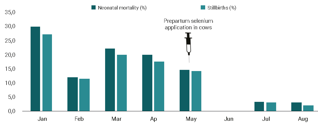 Young animals are more susceptible to clinical disorders associated with selenium deficiency because the metabolic pathways in developing organisms are more easily deregulated than those in adult cattle (Hall et al., 2014). In newborn calves, weakness at birth and high perinatal mortality rates associated with secondary infections can be observed (Bostedt and Schramel, 1990). In cases where the deficiency is severe, cases of nutritional muscular dystrophy may occur (Ammerman and Miller, 1975). The transfer of selenium from cows to newborn calves is done through the placenta and milk (Enjalbert et al., 1999). For this reason, it is essential to ensure the correct supplementation of pregnant cows during the last third of pregnancy (Bayril et al., 2015).