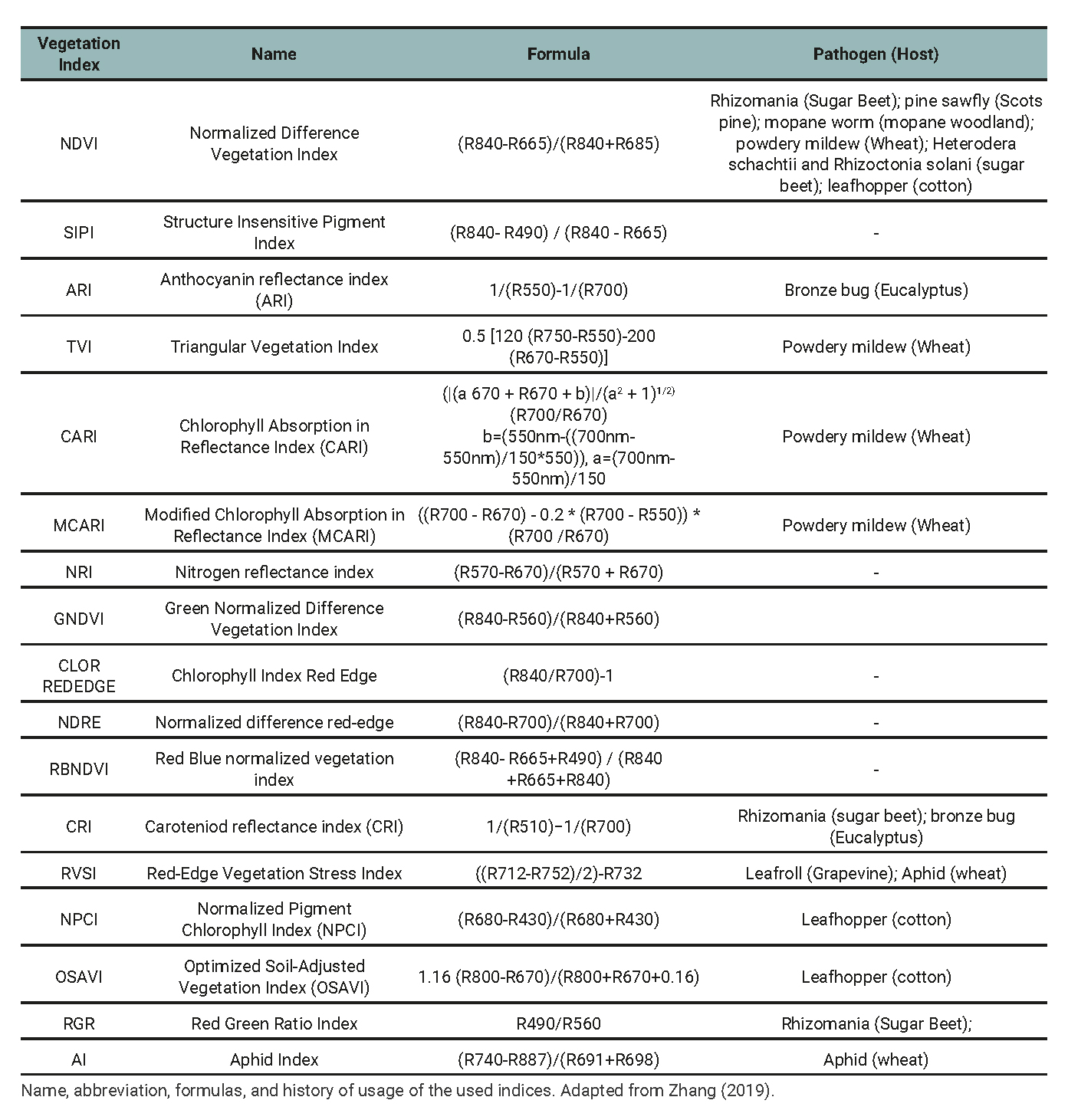 Another index that identified diseases was the CARI, which nonlinearly combines the effects of anthocyanins, chlorophyll a, and red edge. The CARI index was developed by Kim et al. (1994) to minimize the effects of non-photosynthetic materials on remote estimates of absorbed photosynthetically active radiation (Daughtry et al., 2000). This index was identified as one of the best to detect Blumeria graminis in wheat by Zhang et al., (2012). This is because the most suitable spectral regions for studying the effects of pigment reduction by pathogens are those around 680 nm, which correspond to the absorption peak of chlorophyll a, and 550 nm, which coincide with the minimum absorption of chlorophyll in the visible domain. The choice of 700 nm is due to its location at the boundary between the region where the vegetation reflectance is dominated by pigment absorption and the beginning of the portion of the red edge where the structural characteristics of the vegetation have the most influence on the reflectance (Haboudane et al., 2002).