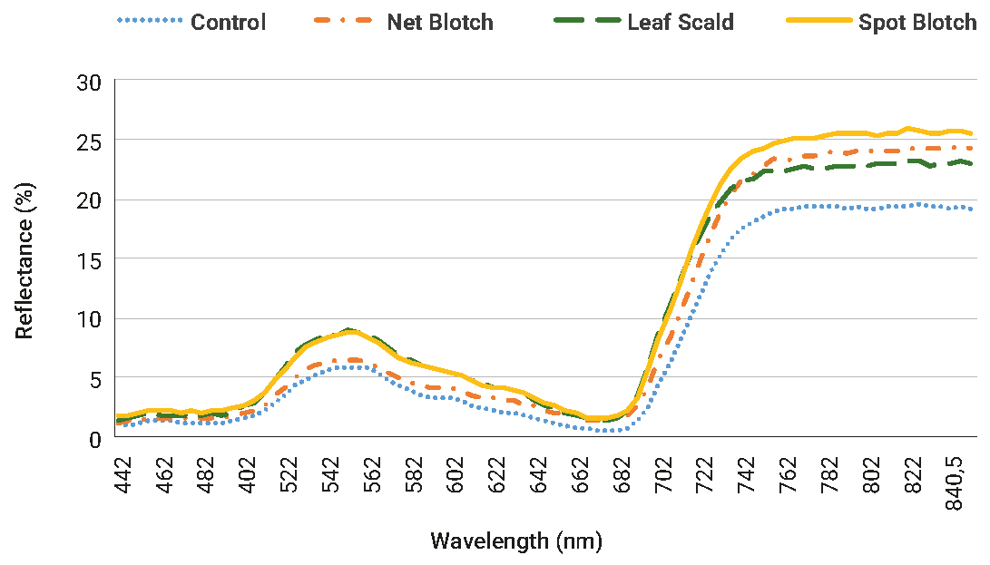Average spectral signatures. Dot: control; Dot dashed: Net Blotch; Dashed: Leaf Scald; Continuous: Spot Blotch.