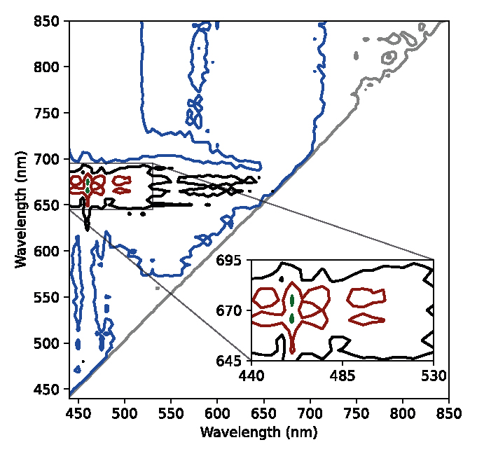 Figure 2 shows the result of the calculation of the MDI for the spectral signatures (twelve spectra: three for each case). This result is a contour plot of Eq. (2) representing the discriminant capacity of the estimator as a function of the wavelengths. From the figure, it is observed that the spectral bands, which maximize the MDI, are 440-490 nm and 645-680 nm. These bands are the most sensitive to differentiate healthy plants from diseased ones based on the spectral signatures obtained in the laboratory.