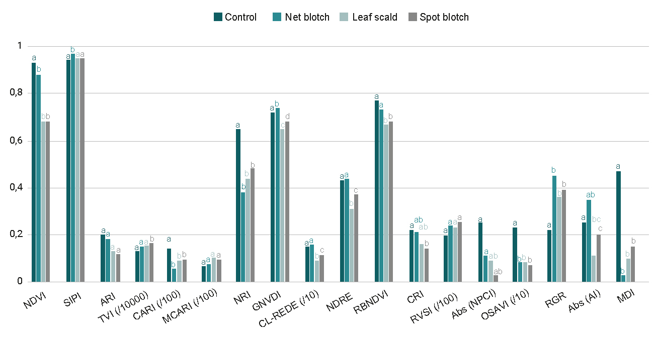 Figure 3 presents the average vegetation index values for healthy and diseased leaves. The same letter above the bars indicates that the averages are not significantly different (p > 0.05). The figure suggests that ARI, MCARI, RVSI and NPCI are not able to discriminate between treatments, whereas SIPI, TVI, CL-REDE, NDRE, RBNDVI, CRI and AI can only identify some of the diseases. On the other hand, NDVI, CARI, NRI, OSAVI, RGR and MDI are suitable to differentiate between healthy and diseased leaves but not between the different diseases. However, it should be noted that, for the present analysis, the aim of the calculation of the MDI was not to differentiate between diseases, but to find the bands where there is greater sensitivity to differentiate between healthy and diseased leaves. Finally, it is apparent that GNDVI is the only index capable of detecting differences between healthy and diseased vegetation as well as between all diseases.