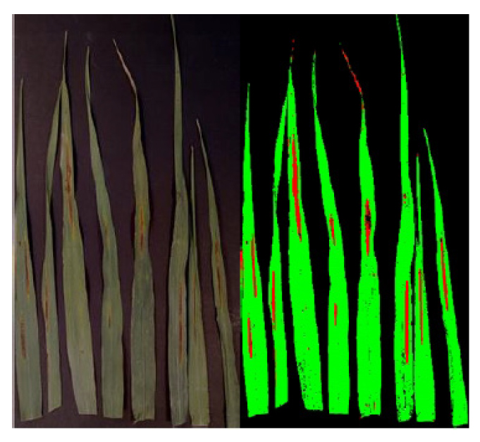 RGB image with net blotch symptoms (left) and image classification (right). Green healthy tissue, red diseased tissue and black background.