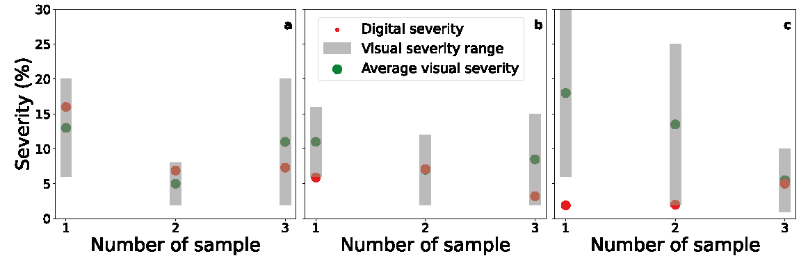 Digital severity (red dots) calculated by image classification and Average visual severity (green dots) estimated by agronomists. The bars depict the range of visual estimations. a) Net blotch, b) Leaf scald, c) Spot blotch.