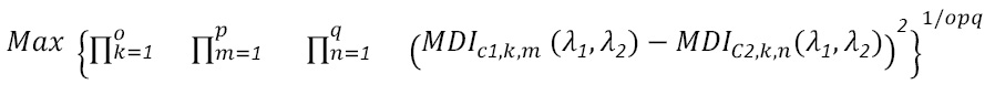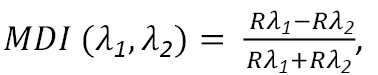 being Rλ1 and Rλ2 the reflectance values in the bands of maximum discrimination. To determine these bands, the geometric mean of the squared differences of the MDI between treatments for all samples is maximized. In mathematical terms, this is expressed as follows