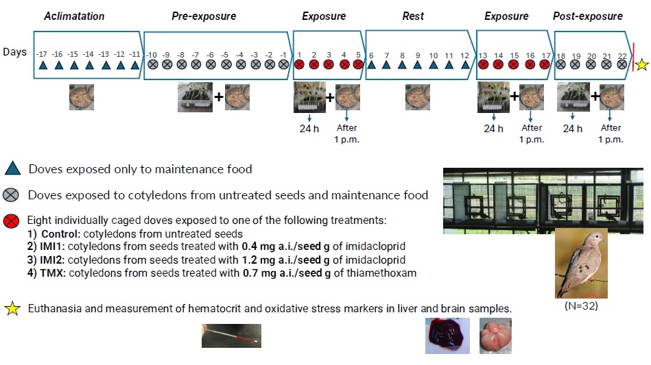 Exposure of birds to treated cotyledons was intermittent to simulate consumption in a field setting. The experiment included the following stages: 1) Acclimatization (7 days): the birds were kept in individual cages with ad libitum maintenance feeding. 2) Pre-exposure (10 days): birds were gradually adapted to cotyledons by offering trays with seedlings and progressively reducing the amount of maintenance food from 20 g to 5 g per day. 3) Exposure 1 (5 days): doves consumed cotyledons treated according to the assigned treatment, with limited access to maintenance feed. Daily, at 8:00 a.m., two trays with a maximum of 20 seedlings each were replenished and from 1 p.m. onwards, 5 g of maintenance food was offered; 4) Post-exposure 1 (7 days): only ad libitum maintenance food was offered. 5) Exposure 2 (5 days): repeat exposure regimen to treated cotyledons. 6. Post-exposure 2 (5 days): identical conditions to the previous stage (Exposure) but with access to untreated cotyledons instead of treated ones (figure 1).