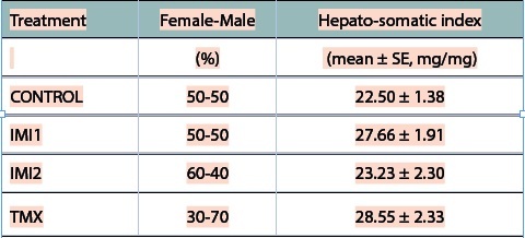 at the end of the post-exposure period 2, the birds were euthanized in a CO₂ chamber and weighed. Blood was drawn from the heart to determine hematocrit by centrifugation of 2-3 capillary tubes at 1400 rcf for 5 minutes. Hematocrit was measured as the packed cell volume percentage. The sex was confirmed by observing the reproductive system. The liver was weighed and its relative weight was calculated as the hepato-somatic index (table 1). Liver and brain samples (n=8 per treatment) were frozen in liquid nitrogen and stored at -80°C until oxidative stress marker analysis.