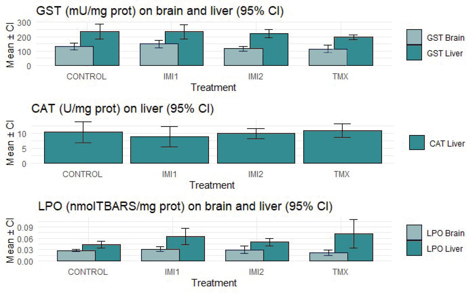 Activities of GST and CAT, and LPO in the brain and liver in each treatment. Error bars indicate the 95% confidence interval (CI).
