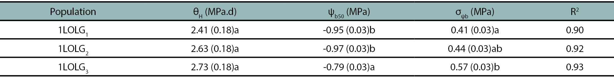 Estimated hydrotime model parameters (standard errors in brackets) describing seed germination of Lolium perenne ssp. multiflorum populations: A herbicide-susceptible (1LOLG1), an acetolactate synthase (ALS) and acetyl coenzyme-A carboxylase (ACCAsa) inhibitor-resistant (1LOLG2), and a 5-enolpyruvylshikimate-3-phosphate synthase (EPSPS; glyphosate), ALS- and ACCAsa inhibitors-resistant (1LOLG3) at a range of water potentials (0, -0.2, -0.4, -0.8 and -1.2 MPa). θ(H) is the hydrotime constant; ψb50 is the median base water potential; σψb is the standard deviation in base water potential and R2 is the coefficient of determination of the regression of probit germination against base water potential. On each column, identical letters are not significantly different at p>0.05 by LSD multiple range test.