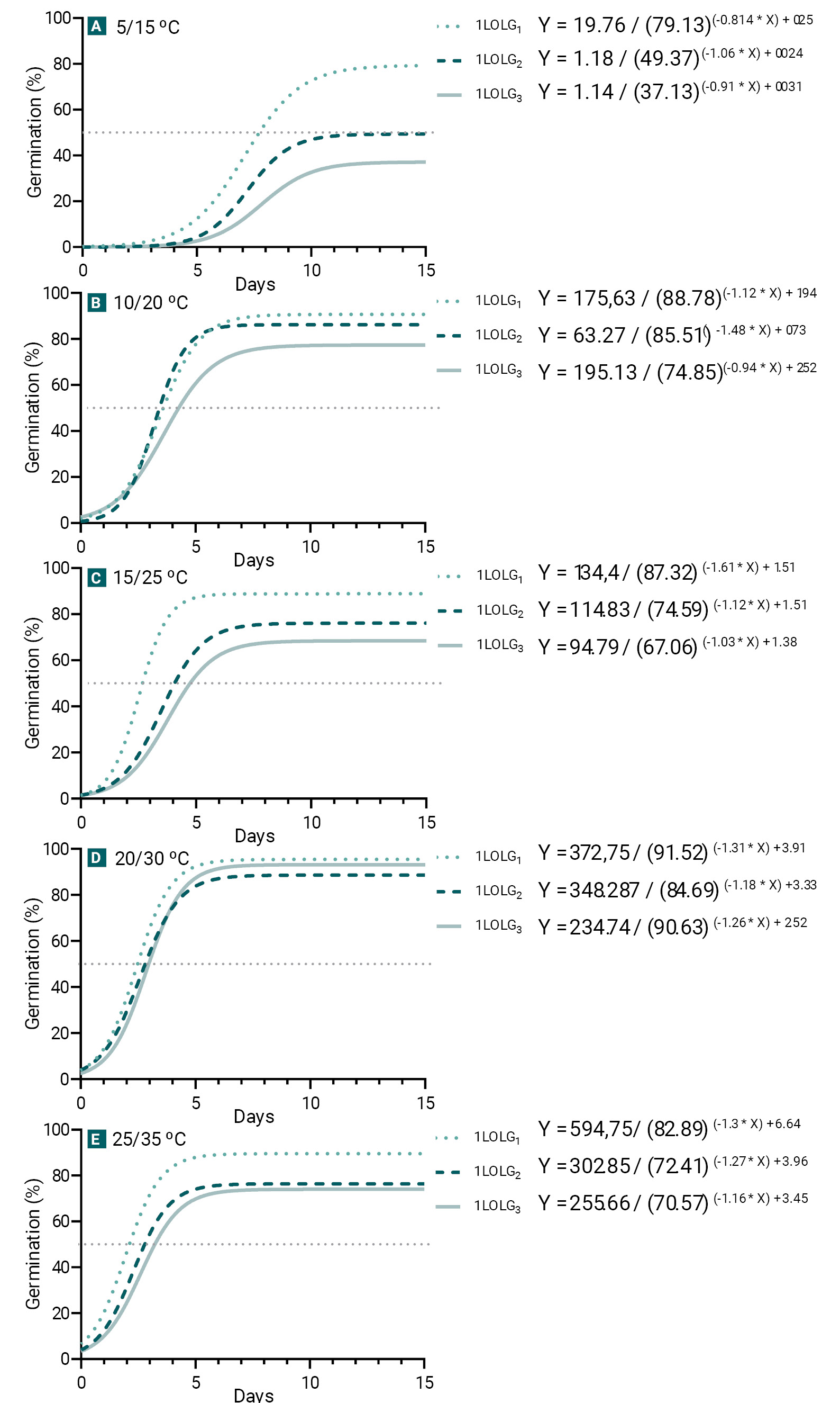 The comparison of Lp was conducted using a thermal time model (García-Huidobro et al., 1982). Given the temperatures used in the experiment and the broad thermal window for Lolium seed germination, the analysis focused only on the suboptimal temperature range as defined by the following equation: