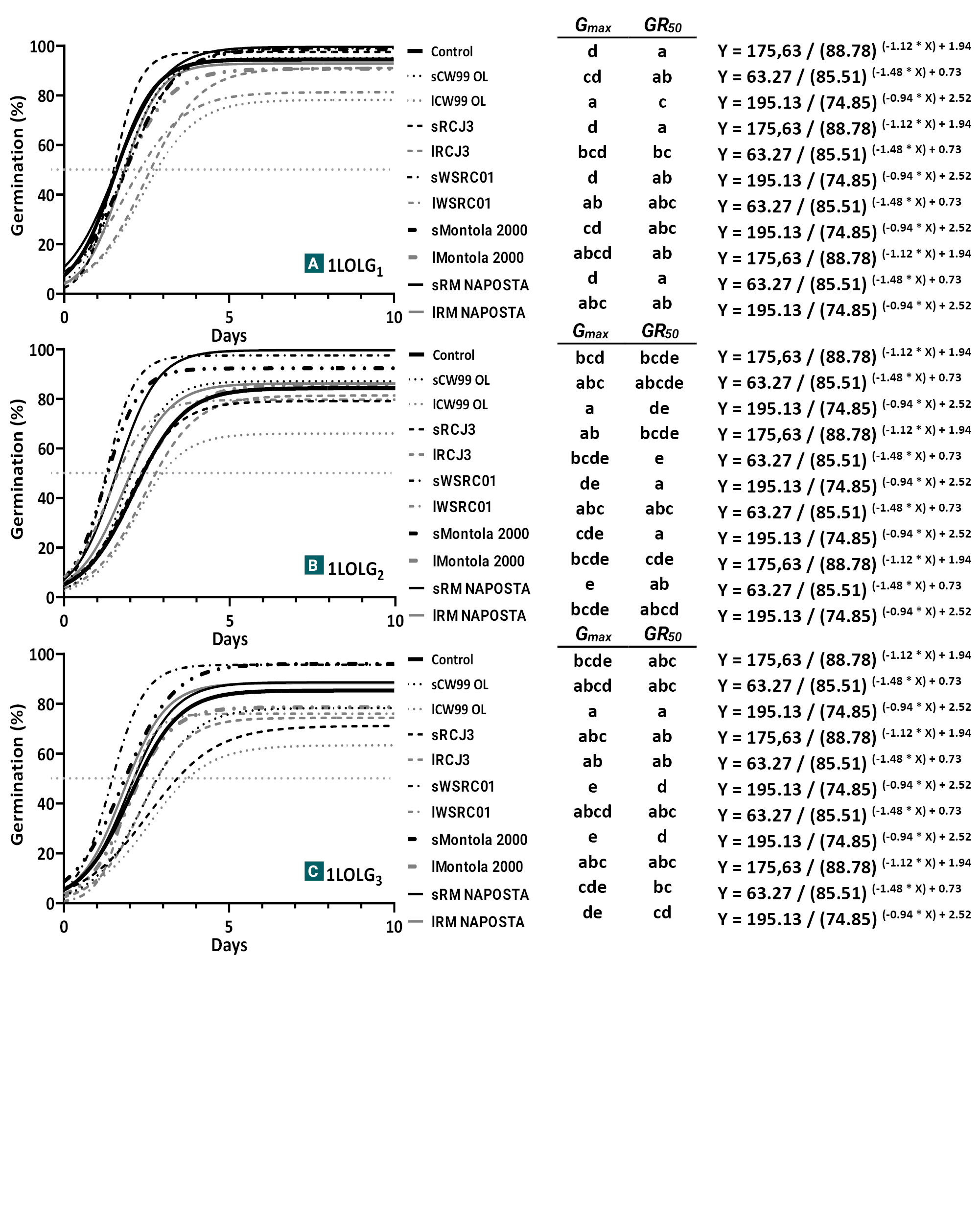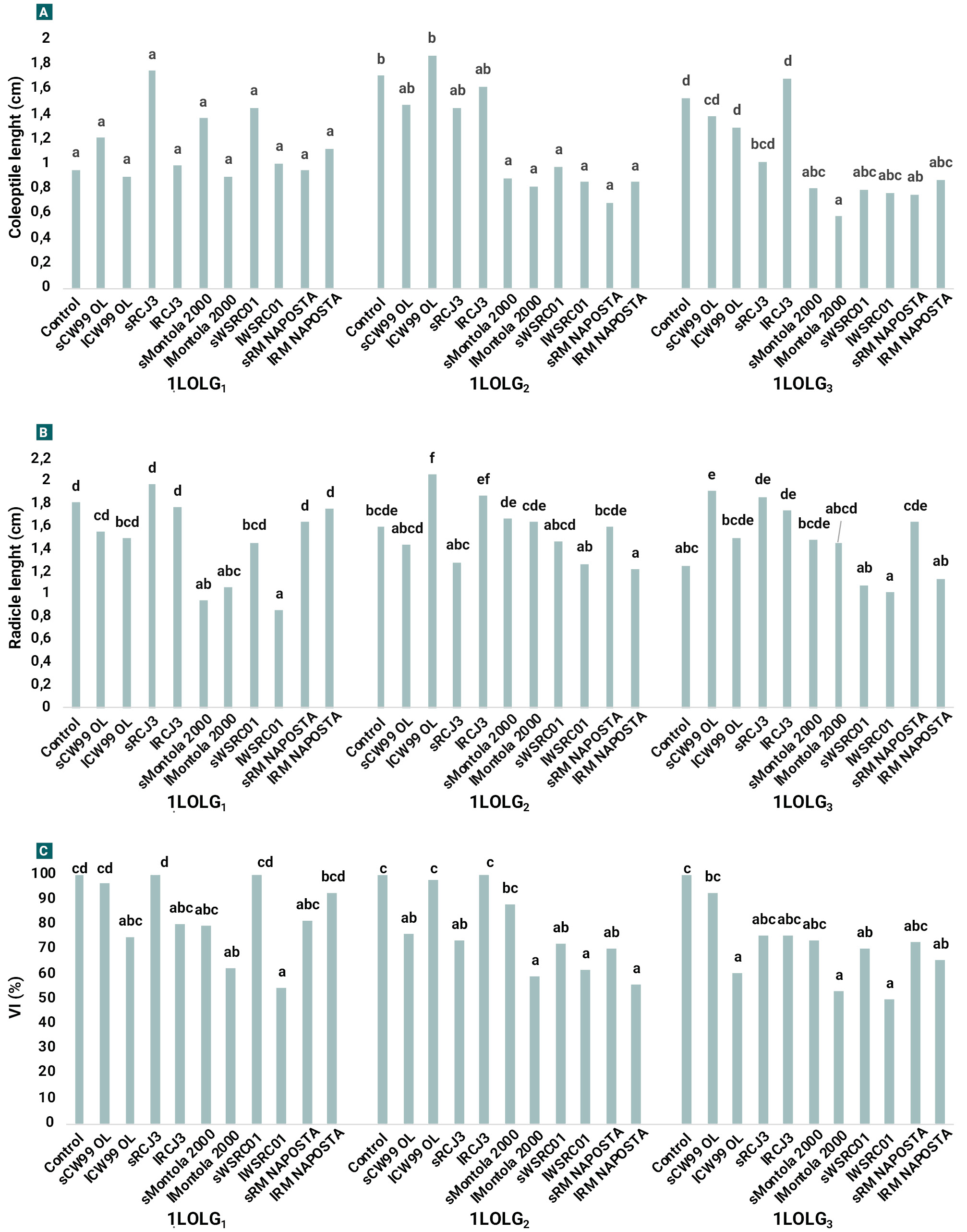 Finally, vigor index was reduced in 1LOLG1 by lMontola 2000 and lWSRC01 treatments. In 1LOLG2, VI was reduced by sCW99 OL, sRCJ3, lMontola 2000, s-lWSRC01 and s-lRM NAPOSTÁ treatments. In 1LOLG3, VI was reduced by the lCW99 OL, lMontola 2000 and lRM NAPOSTÁ and by both WSRC01 treatments (p<0.05; fig. 4C).