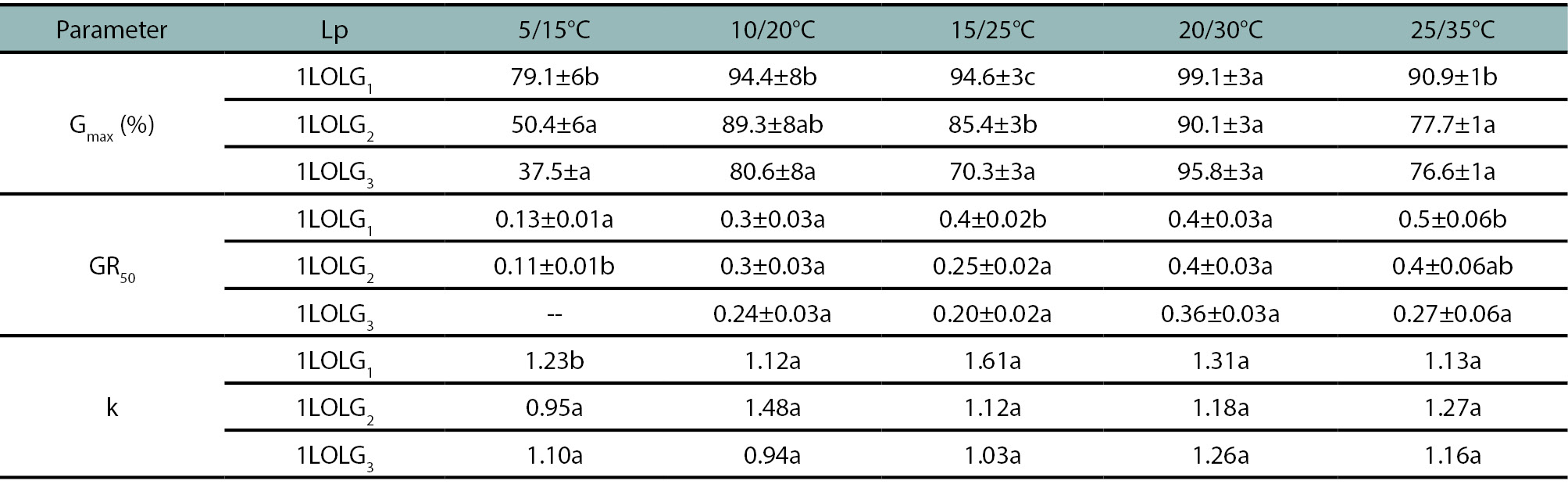 The estimated of the mean and standard errors for germination parameters of Lolium perenne ssp. multiflorum populations. 1LOLG1: an herbicide-susceptible, 1LOLG2: acetolactate synthase (ALS) and acetyl coenzyme A carboxylase (ACCAsa) inhibitors-resistant and a 5-enolpyruvylshikimate-3-phosphate synthase (EPSPS; glyphosate), ALS- and ACCAsa inhibitors-resistant (1LOLG3) at a range of alternate temperatures (5/15, 10/20, 15/25, 20/30 and 25/35°C). Gmax represents the maximum germination achieved, the GR50 indicates the germination rate, calculated as the inverse of the time required to reach 50% germination and k is the logistic model rate constant. On each row, Gmax and GR50 are compared between Lp by LSD multiple range test and k by extra sum-of-squarer F test, identical letters are not significantly different at p>0.05.