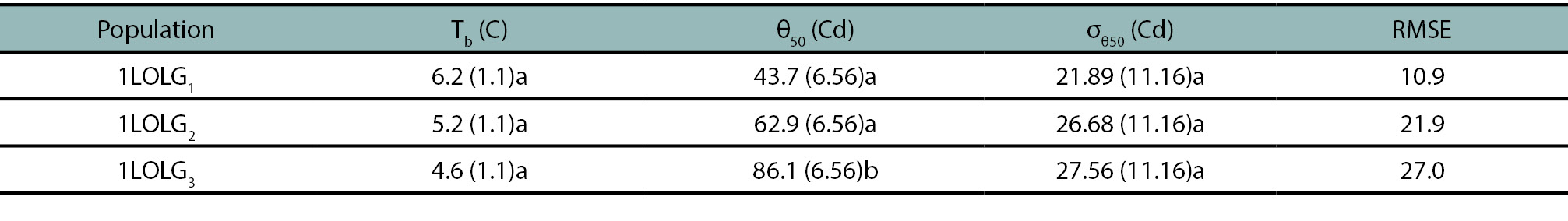 Estimated parameters of the suboptimal thermal time model (standard errors in brackets) describing seed germination of Lolium perenne ssp. multiflorum population. 1LOLG1: an herbicide-susceptible, 1LOLG2: acetolactate synthase (ALS) and acetyl coenzyme A carboxylase (ACCAsa) inhibitors-resistant and a 5-enolpyruvylshikimate-3-phosphate synthase (EPSPS; glyphosate), ALS- and ACCAsa inhibitors-resistant (1LOLG3) at a range of alternate temperatures (5/15, 10/20, 15/25, 20/30 and 25/35°C). θ(50) and σ(θ50) are the mean and standard deviation, respectively, of the normal distribution of the suboptimal thermal time. Tb is the base temperature and RMSE is the root mean square error (goodness of fit). On each column, identical letters are not significantly different at p>0.05 by LSD multiple range test.