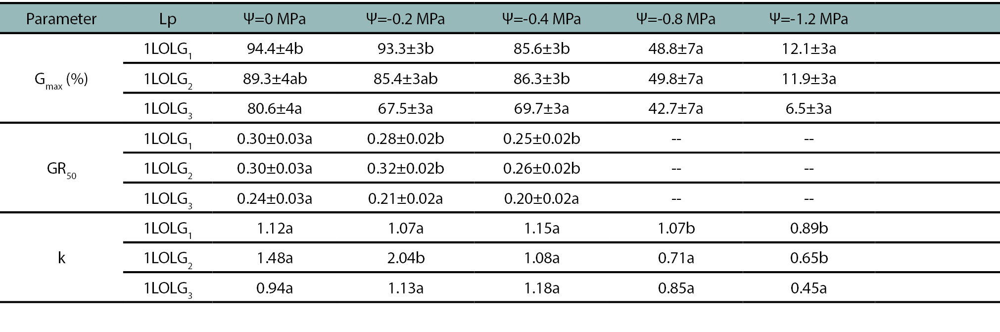 All Lp exhibited similar germination behavior when subjected to osmotic potentials ranging from 0 to -0.4 MPa, but germination decreased to 50% and 10% at -0.8 and -1.2 MPa, respectively (fig. 2; p<0.01). Between 0 to -0.4 MPa, 1LOLG3 showed the lowest Gmax and GR50 values, while 1LOLG1 presented the highest Gmax and k (table 3, fig. 2a-c; p<0.05). The mean germination time was 4.5 days between 0 and -0.4 MPa, 6.2 days at -0.8 MPa, and 7.6 days at -1.2 MPa (p<0.01) for all Lp.
