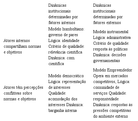 Peter Maasen e Johan Olsen (2007) propuseram uma tipologia interessante para se entender as diferentes lógicas institucionais que predominam em diferentes arranjos de governança das universidades. A tipologia propõe distinguir as instituições universitárias considerando duas dimensões: o grau de convergência dos valores sustentados por diferentes atores internos acerca das normas e objetivos da instituição; e a relevância maior ou menor dos fatores externos na determinação das mudanças experimentadas pela instituição. Assim, a tipologia proposta por esses autores distingue 4 tipos diferentes de instituição universitária (quadro 1, abaixo):