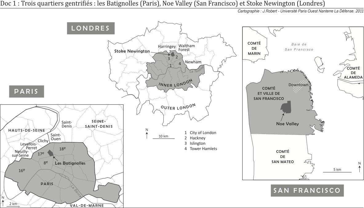 Nesse contexto, este artigo se propõe a estudar as maneiras de viver e de conviver das crianças – e suas variações – nos bairros gentrificados, questionando os efeitos do contexto residencial e das características sociais das crianças. Ele se baseia em uma pesquisa realizada em três bairros gentrificados de Paris (Batignolles), Londres (Stoke Newington) e São Francisco (Noe Valley)[3], cujo objetivo geral era estudar as relações de coabitação que se instauram nos bairros gentrificados entre as famílias “gentrificadoras” (de classes médias ou médias-altas) e as famílias “gentrificadas” (de classes populares), por meio das crianças[4]. Trata-se de analisar como as crianças são levadas em conta nas escolhas residenciais dos habitantes desses bairros, de estudar como as crianças intervêm nas maneiras de habitar e de coabitar das famílias “gentrificadoras” e das famílias “gentrificadas”, mas igualmente de observar as maneiras de viver e de conviver das próprias crianças. Nessa perspectiva, e a fim de distinguir ao mesmo tempo tendências comuns e diferenciações “locais”, escolhemos trabalhar sobre três grandes cidades onde os processos de gentrificação são bem documentados (Lehman-Frisch, 2002; Butler; Robson, 2003; Clerval, 2008) e cujas respectivas municipalidades recentemente apontaram a questão das crianças (de seu declínio numérico e das desigualdades crescentes que as afligem) como uma de suas maiores preocupações. Dentro dessas três cidades, os bairros selecionados têm todos um passado solidamente popular e atravessaram, igualmente, uma fase de declínio socioespacial antes de serem procurados pelas camadas médias e médias-altas, a partir de 1980 e, sobretudo, 1990. São também, todos os três bairros, identificados pelos moradores como “muito familiares”, onde as crianças estão sobrerrepresentadas em relação às cidades nas quais se inscrevem. No interior desses bairros, o trabalho de pesquisa tomou a forma de investigação ao mesmo tempo junto aos adultos e junto às crianças.
