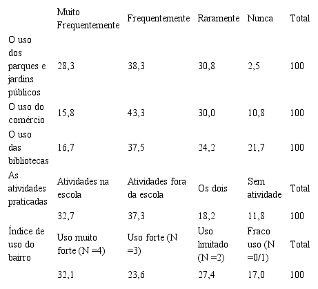 Se as crianças apreciam os bairros gentrificados e se elas os conhecem bem, é porque elas têm um uso intensivo dos mesmos. Então, grande número delas acumula diversos tipos de práticas (o uso do comércio, dos parques ou das bibliotecas, ou ainda a prática de atividades extraescolares), como mede o índice de uso do bairro (cf.quadro 4). Um terço dessas crianças acumula ainda o conjunto desses usos e ao contrário, apenas uma minoria tem um uso fraco do bairro, praticando apenas uma ou mesmo nenhuma dessas atividades. O bairro não se reduz assim, a um mero cenário para a maioria dessas crianças.