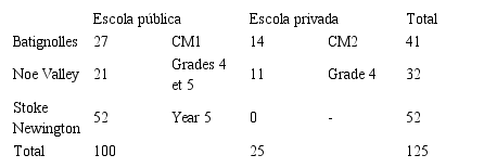 As análises e os resultados apresentados neste artigo são derivados de uma pesquisa conduzida junto a 125 crianças, 63 meninas e 62 meninos, com idades entre 9 e 11 anos. Para construir essa população, e em particular para se ter uma amostra diversificada de crianças, nós escolhemos, em cada um dos três bairros da pesquisa, uma escola pública e uma escola privada[13], e dentro de cada escola, uma classe de Curso Médio primeiro ano (CM1) ou uma classe de Curso Médio segundo ano (CM2) ou de níveis equivalentes (Year 5 em Londres, Grades 4 e 5 em São Francisco).