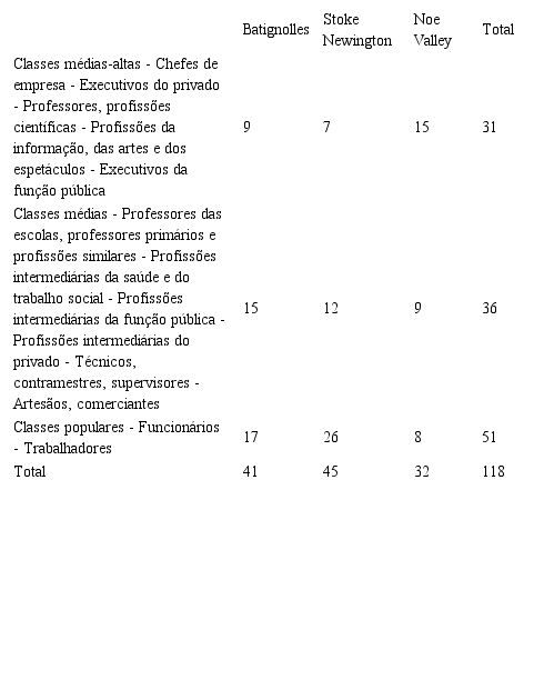 Para codificar o meio social das crianças, utilizamos a classificação das profissões e categorias sociais (PCS) do Instituto Nacional da Estatística e dos Estudos Econômicos (INSEE) e distinguimos três grandes categorias: as classes médias-altas, as classes médias e as classes populares. No caso de Noe Valley e Stoke Newington, estabelecemos equivalências entre as profissões dos pais (informadas pelas escolas, retendo classicamente a profissão da pessoa de referência da família) e a nomenclatura francesa.