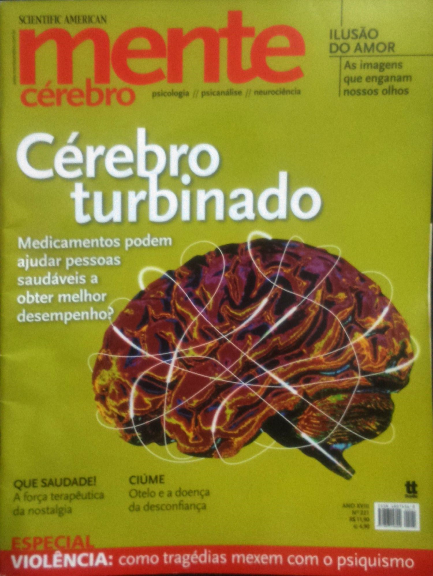 Na edição 221, de junho de 2011, o título é: Cérebro Turbinado: Medicamentos podem ajudar pessoas saudáveis a obter melhor desempenho? Na capa, o órgão é tratado a partir da proposta de medicamentos que podem potencializar sua performance (figura 2). No lugar de veias e sangues, as rugosidades são preenchidas por cores lembrando os exames de tomografia computadorizada, referindo-se a diferentes regiões do cérebro sendo ativadas. O próprio contorno do órgão é circundado por linhas brancas que insinuam fios/circuitos eletrônicos, sugerindo intensa atividade neuronal, reforçado por áreas mais largas, onde esse movimento elétrico seria mais intenso.