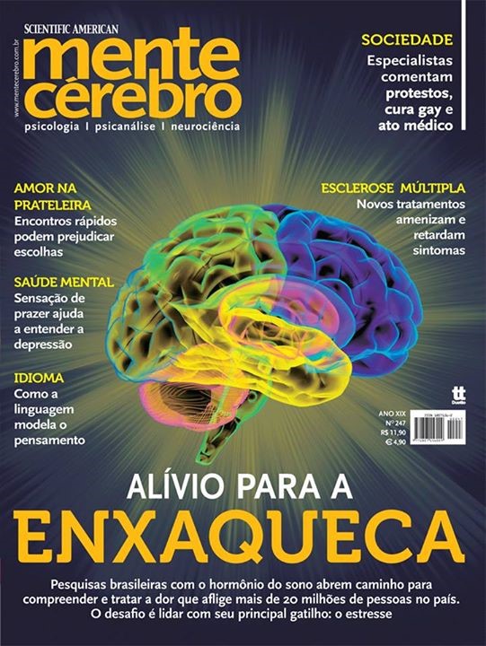 A edição 247, de agosto de 2013, traz o cérebro figurando o centro de uma dor. A manchete “Alívio para a Enxaqueca: Pesquisas brasileiras com o hormônio do sono abrem caminho para compreender e tratar a dor que aflige mais de 20 milhões de pessoas no país. O desafio é lidar com seu principal gatilho: o estresse” (figura 5).