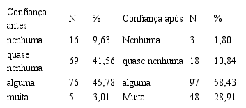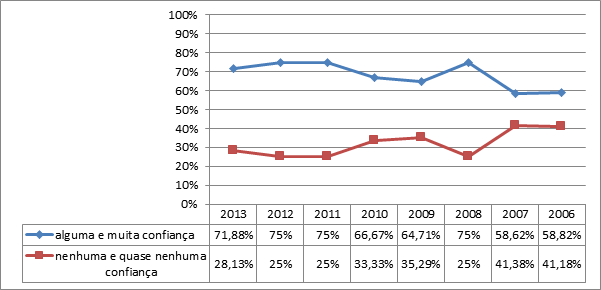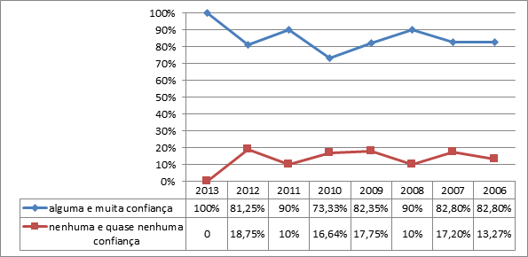 Apesar de ficar visível uma diminuição do nível da confiança conjuntamente com o tempo decorrido da participação, é possível constatar certa constância da confiança nas instituições partidárias tendo-se como referência os dois maiores e menores níveis. É importante destacar a predominância de respostas nos dois graus intermediários – quase nenhuma confiança (23%) e alguma confiança (56%).