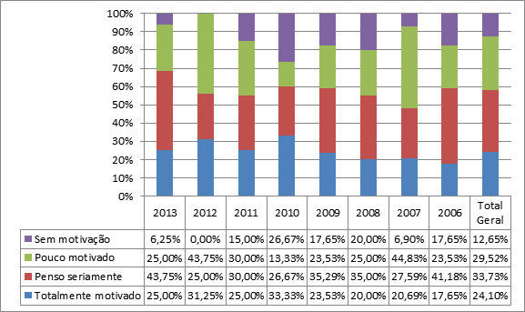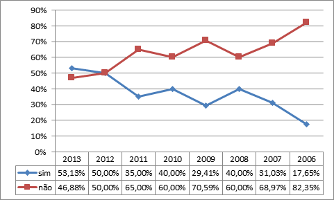 Foi indagado também se a participação no PJB havia gerado interesse no participante em candidatar-se, com alternativas binárias (sim ou não), sendo que 38% dos egressos responderam positivamente. No gráfico 4, a seguir, fica clara uma forte diminuição da percepção desse estímulo com o passar dos anos transcorridos da participação, tendo a turma mais recente (2013) apontado pouco mais de 53% de jovens estimulados, já no último ano analisado (2006) apenas cerca de18% confirmaram este estímulo.