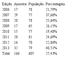 Intentou-se a realização de um censo junto aos participantes, mas ao final da coleta de dados, optou-se pela exclusão das respostas relativas aos dois anos iniciais (2004 e 2005), em vista do baixo índice de respostas advindo da dificuldade de contato com esse grupo. Assim, a análise final contempla oito anos de execução do PJB, isto é, de 2006 a 2013, totalizando 166 respondentes, o que corresponde a 27,43% do total de egressos das oito edições mencionadas (universo de 605 participantes). Essa decisão foi tomada com base nas diversas características desse público analisado no estudo, entre elas, gênero, idade, moradia em capital ou cidade do interior e escolaridade[1], já que a análise de uma amostra com apenas duas (2004) ou cinco (2005) respostas não abarcaria esses variados fatores necessários à compreensão dos fenômenos estudados.