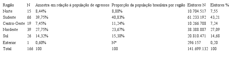 A quantidade de vagas do projeto é proporcional ao quantitativo de cadeiras na Câmara dos Deputados que, por sua vez, está vinculada à população dos estados brasileiros. Conforme pode ser verificado na Tabela 3, a realização da pesquisa resultou numa proporção muito próxima entre a amostra e a população de eleitores das regiões, com leve diferença em algumas e um maior percentual na amostra do Sudeste. Considera-se assim que os dados levantados têm uma boa representatividade do perfil dos egressos do PJB.