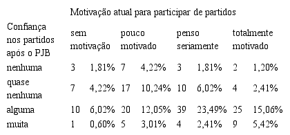 Conforme preceitos da teoria da cultura cívica, a confiança é fator preponderante para a participação no contexto democrático (Almond; Verba, 1965). Nesse sentido, o cruzamento do nível de confiança dos egressos e da motivação para a participação institucional em partidos políticos pode dar-nos uma perspectiva de análise mais aprofundada, conforme demonstrado na Tabela 6.
