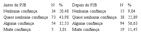 A variação da confiança em relação ao Poder Legislativo foi sensível. Foi perguntado qual seria o nível de confiança antes e, em outra questão, qual passou a ser o nível de confiança após o PJB, com ambas as questões respondidas no mesmo questionário. Fica evidente nos resultados uma variação significativa da confiança, enquanto que a maioria dos egressos considera seu nível de confiança no Legislativo, antes do PJB, nos dois menores níveis (51%), após a simulação parlamentar 87% se identificam com os dois maiores níveis.