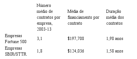 Se compararmos os contratos WFO entre os tipos de empresas – usando as empresas Fortune 500 e as pequenas empresas apoiadas pelos SBIR/STTR como categorias principais de análise – surgem também detalhes mais nítidos das relações entre laboratório-empresa. Os contratos com as empresas Fortune 500 são, em média, maiores em tamanho, ligeiramente de maior duração, e essas empresas são mais propensas a firmar múltiplos contratos WFO (ver Tabela 1). Isso significa que, embora a proporção de acordos assinados com as Fortune 500 em comparação com empresas menores seja aproximadamente equivalente, individualmente existem mais empresas SBIR/STTR do que empresas Fortune 500 empregando o mecanismo contratual WFO. Ou seja, as relações com empresas maiores no LBNL parecem ser mais densas e contínuas, enquanto que os contratos com empresas menores são mais propensos a ser acordos pontuais ou ocasionais vinculados a projetos específicos e, muitas vezes, dependentes do financiamento de outro programa federal[13].
