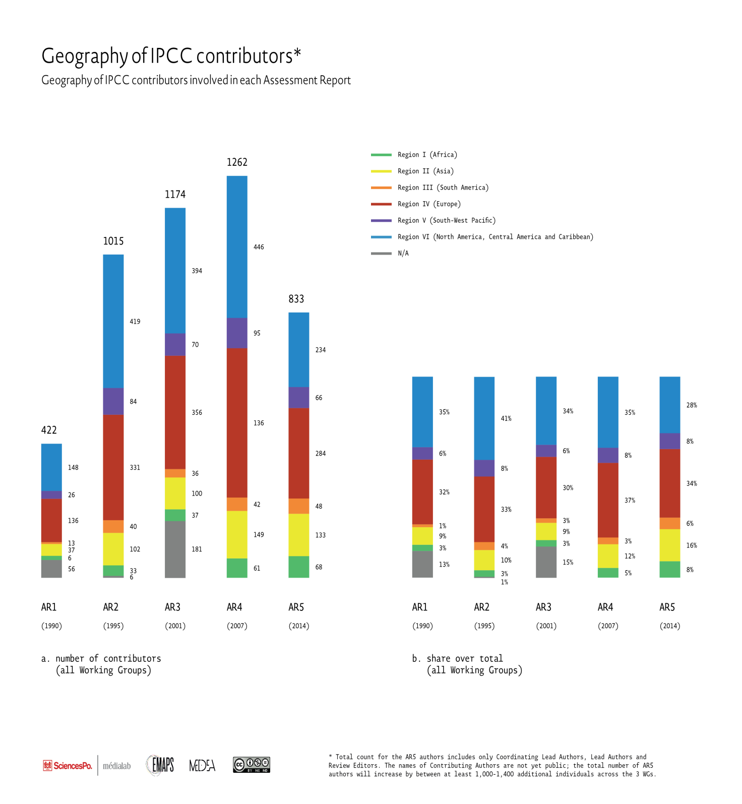 No entanto, a divisão Norte-Sul do trabalho no IPCC é significativa, demarcando e definindo o conhecimento sobre mudanças climáticas. Apesar da crescente atenção dada pelo comitê diretor do IPCC à participação de autores e revisores de países em desenvolvimento no processo de avaliação, o percentual tanto de autores quanto de revisores das nações do Sul global tem sido pequeno em todos os relatórios do IPCC (ver figura 1).