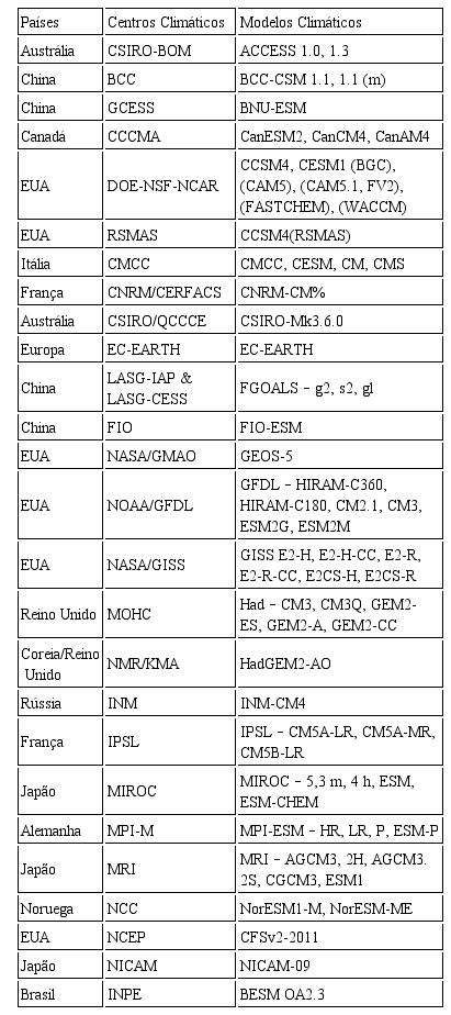 Como evidencia a Tabela 1, a maioria dos centros climatológicos participantes do CIMP5 são norte-americanos, europeus ou de nações asiáticas desenvolvidas, como Japão e Coreia do Sul. Brasil e China são exceções do “Sul”. Deve-se notar (na terceira coluna) que os Estados Unidos participam com a produção de 22 modelos, o que denota uma alta capacidade de modelagem climática e um maior volume de simulações incluídas no banco de dados do CMIP5 em comparação com outros países[10].