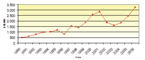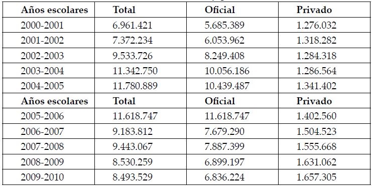 De este cuadro lo más significativo es el salto que se da a partir de 2003 cuando entran en escena las Misiones Educativas, sector al que se le debe este aumento de escolaridad, pero con un dato que se podrá apreciar mejor a partir de 2013. Se trata de una política que se desarrolla paralelamente al sistema escolar oficial y que, a la larga, al cumplir sus objetivos, tendrá efectos en la caída nuevamente de la matrícula escolar. Veamos el comportamiento del sistema diferenciando el sector oficial de los planteles privados y excluyendo la matrícula universitaria.