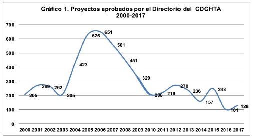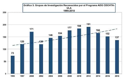 Las reducciones presupuestarias y limitaciones en las políticas de financiamiento de los programas de los Consejos de Desarrollo Científico Humanístico Tecnológico y de las Artes (CDCHTA) marcaron la pauta del declive de la productividad en la universidad venezolana llegando a ser cero el apoyo a programas de viajes al exterior y organización de congresos internacionales, el diferencial cambiario destruyó la opción real; al respecto Alejandro Gutiérrez del CDCHTA Universidad de Los Andes (ULA) nos apunta: "el retroceso que la actividad de investigación ha tenido en la universidad (...) ULA ha venido disminuyendo el número de proyectos de investigación financiados, el número de investigadores reconocidos por el Programa de Estímulo a la Investigación (PEI-ULA) desde 2013 y el número de Grupos de Investigación reconocidos y certificados por el Programa de Apoyo Directo a Grupos de Investigación (ADG) desde 2014."68 Afirmación que puede ser validada en el siguiente gráfico: