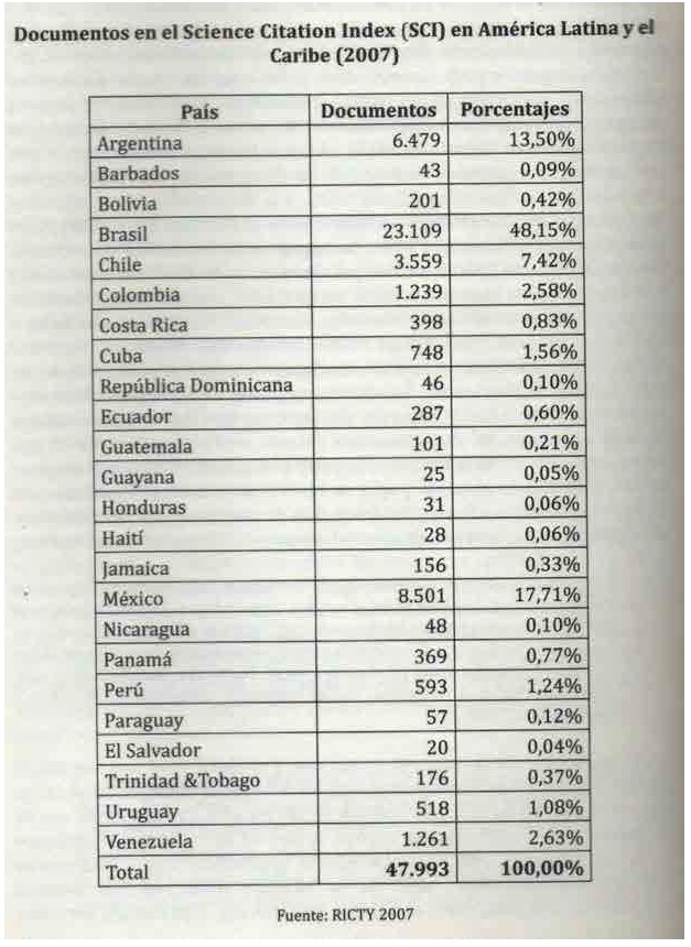 Lo cierto es que, según el balance oficial de la ONTIC, Venezuela se ubicaba entre los primeros 5 lugares de las publicaciones en SCI (2002-2006) registradas en América Latina: Brasil, México, Argentina, Chile, y Venezuela; tomando como referencia el ScienceCitationIndex (2007):