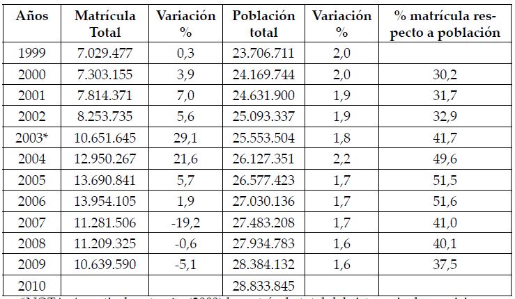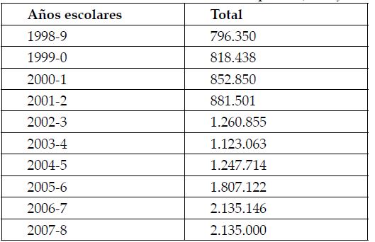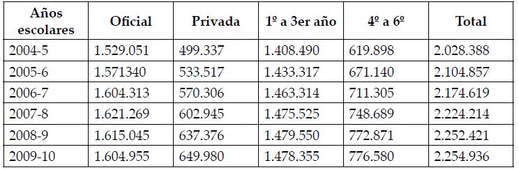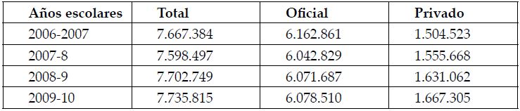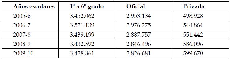 En este sentido, a partir de 2006 se aprecia una contracción y una caída de la matrícula en términos absolutos, ya que cae por debajo de la cifra de alumnos en planteles oficiales en el año escolar 2002-2003, que estaba por encima de los 8 millones de alumnos. Veamos por nivel: En el año escolar 1998-9 se contabilizaron 882.468 niños en el nivel preescolar. Para el periodo 2002-3 la cifra de alumnos atendidos es de 946.761, es decir, hay un leve crecimiento. Para el 2005-6 la cifra pasa a 1.355.373 alumnos, sumando 344.427 inscritos en sistemas de atención no convencional. En el año escolar 2009-10 la cifra sube a 1.563.117 de niños atendidos. Es decir que en este nivel hay un crecimiento en la expansión de la matrícula en toda la década. Si pasamos a la educación primaria, entre el 2005 y el 2010, apreciamos lo siguiente: