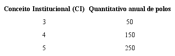 Para a abertura dos Polos serão obedecidos os critérios do art. 12, que faz uma relação entre a nota de avaliação institucional (CI) e o número de Polos possíveis conforme segue: