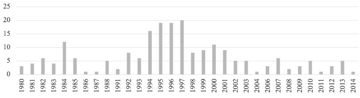 Dichos antecedentes dan contexto a la lectura de fuentes primarias para reconstruir los eventos de la historia reciente de la educación en el Departamento del Atlántico, el cual inicia un proceso formal de descentralización educativa a finales de los años 80 y que no necesariamente representa el mismo proceso que se dio en que otras regiones del país57. La fuente de información primaria de este artículo fue recolectada en el Archivo Histórico de la Asamblea Departamental del Atlántico. Según el artículo 72 del Decreto 1222 de 1986, las ordenanzas son "[l]os actos de las asambleas departamentales destinados a dictar disposiciones para el arreglo de alguno de los asuntos que son de su incumbencia". Como tal, al menos en su sentido normativo, los contenidos de estos documentos son reflejo del máximo ejercicio de deliberación democrática en el nivel territorial58. El gráfico 1 muestra la distribución por año de las 209 ordenanzas consultadas entre el periodo 1980 y 2014. La recolección fue hecha por un historiador profesional y con experiencia previa en este tipo de consultas59.