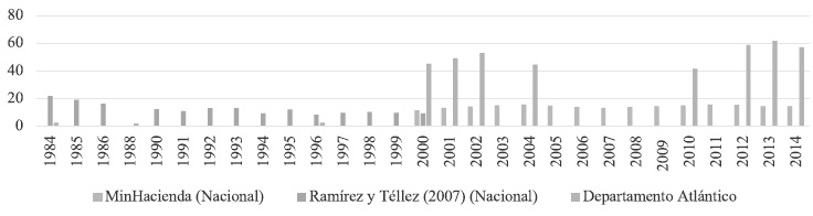 Fuente: Cálculo de los autores a partir de ordenanzas departamentales y documentos publicados en la página de la gobernación del Atlántico. Los datos Nacionales provienen del Ministerio de Hacienda y Crédito Público y la base de datos de Ramírez & Téllez60.