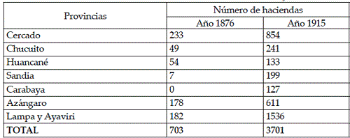 La contraparte del despojo de los pastizales de los indígenas comuneros fue la expansión e incremento del número de haciendas. En torno a este fenómeno existe un hito bien definido que, además, coincide con el inicio del gobierno de don Nicolás de Piérola en el año 189525. Durante el largo y continuo crecimiento de las fortunas de la industria lanera desde 1880, la forma de respuesta predominante del terrateniente había sido la expansión de sus haciendas a través de la incorporación de tierras ocupadas por indígenas, pero para la década de 1910 casi todas las grandes haciendas habían sido consolidadas y los costos sociales de ulteriores expansiones se volvían prohibitivos al fortalecerse la oposición de los indios26.