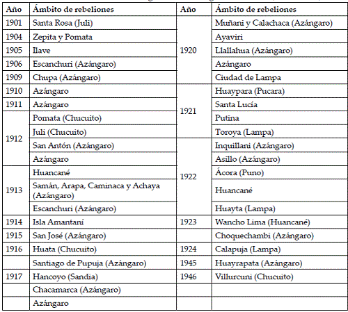 El proceso de sublevación campesina marcha paralelo al de expansión de las haciendas, que es precisamente en el periodo 1895-1925, en el cual el precio de las lanas y de las fibras alcanza las cifras más altas, y cuando es más significativo el excedente de las tierras ganaderas de Puno, que vemos agudizarse un conflicto de clases y etnias, que se traduce en una multiplicación de las sublevaciones indígenas42. Las rebeliones de Wancho Lima y Rumi Maqui sirven de referencia para glorificar la rebeldía puneña contra los diversos rostros de la dominación, discriminación, abuso o exclusión. Las dos primeras décadas del siglo XX destacan dos antes de la rebelión de Wancho Lima: el alzamiento de Juan Bustamante Dueñas (1866-1868) y el de Teodomiro Gutiérrez Cueva (1915)43.