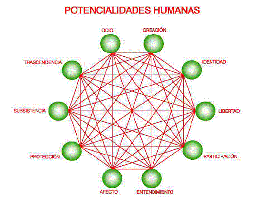 Por otra parte, el concepto de capacidades ha sido tratado por muchas/os autoras/es de entre los que destacaré a Amartya Sen53, Martha C. Nussbaum54 y Manfred Max-Neef55. Este último nos ofrece una propuesta matricial y no jerárquica de las capacidades que se aviene muy bien con el planteamiento complejo y transdisciplinar de la paz imperfecta (Fig. 2).