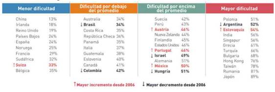 En ese sentido, según Hays (2018), México y Colombia tienen mayor dificultad para encontrar personal idóneo, a consecuencia de la escasez de talento especializado. Sería preferible identificar la causa de la escasez, pues puede derivarse de la oferta educativa, de las carencias formativas o de la incongruencia entre la necesidad del mercado laboral y la elección de las nuevas generaciones respecto de su carrera profesional.