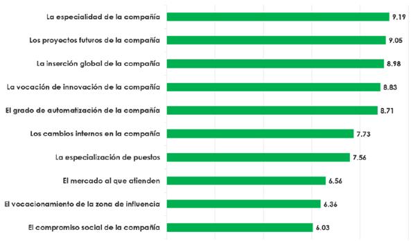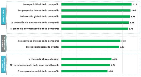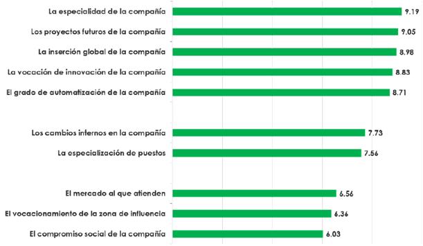 En este se encontraron las carreras necesarias para el mercado laboral, pero antes se identifican los factores determinantes de dicha necesidad. Se concluye a partir de la gráfica 5, la relación directa entre la especialidad de la empresa (con valoración de 9.19) y el tipo de carreras que requiere el mercado laboral. Se identifican otros determinantes con puntajes altos para las nuevas generaciones que significan, la dependencia de la necesidad de carreras con proyectos futuros.